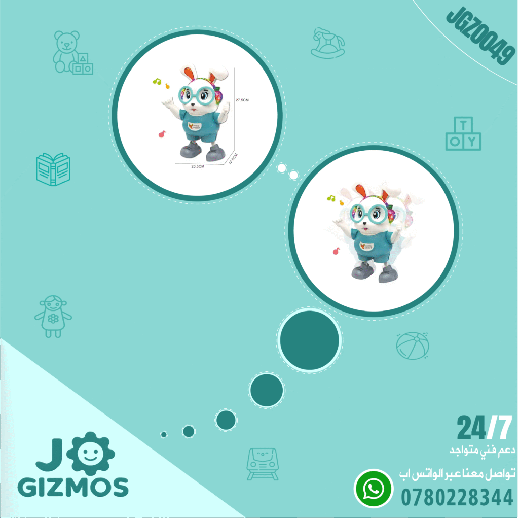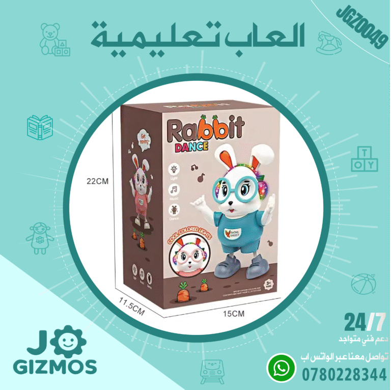 🎲 هي لعبة على شكل أرنب يقوم بالرقص. تشير العلبة إلى أن اللعبة مزودة بأضواء وموسيقى وأضواء ملونة جذابة.