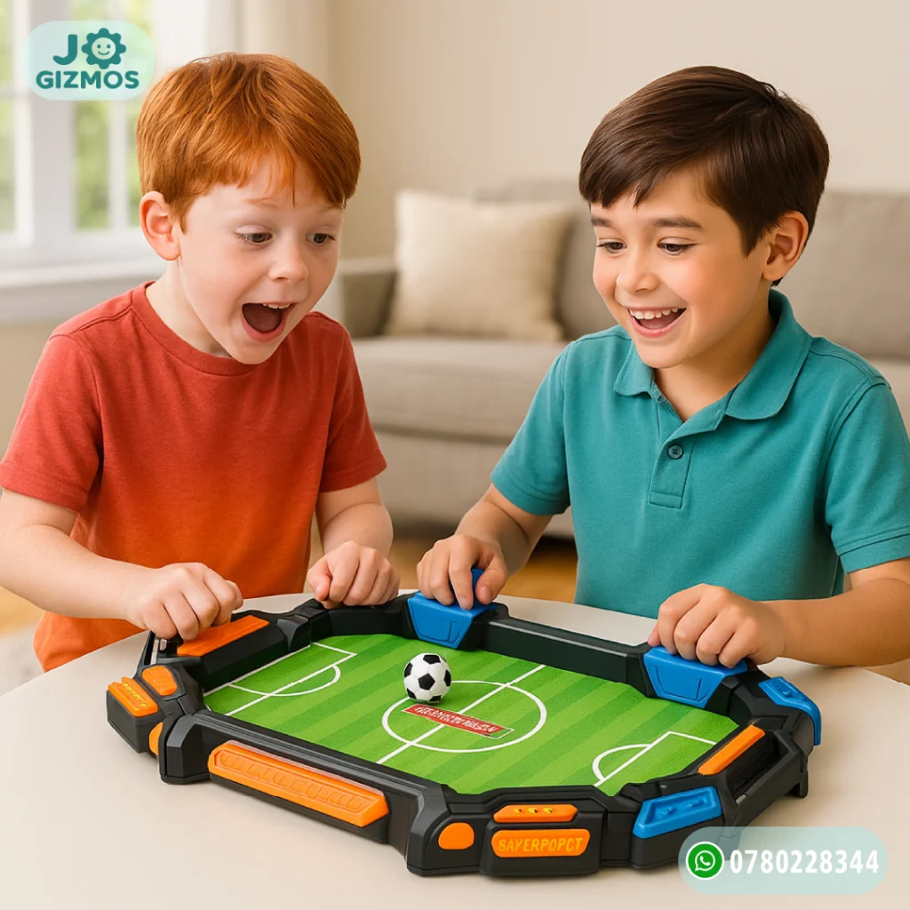 🎲 لعبة تفاعلية مشوقة تحاكي أجواء مباريات كرة القدم بأسلوب إلكتروني يدوي، حيث يقوم كل لاعب باستخدام المقبض لتصويب الكرة إلى مرمى الخصم. اللعبة تنمّي سرعة رد الفعل والدقة، وتضفي أجواء حماسية داخل المنزل.