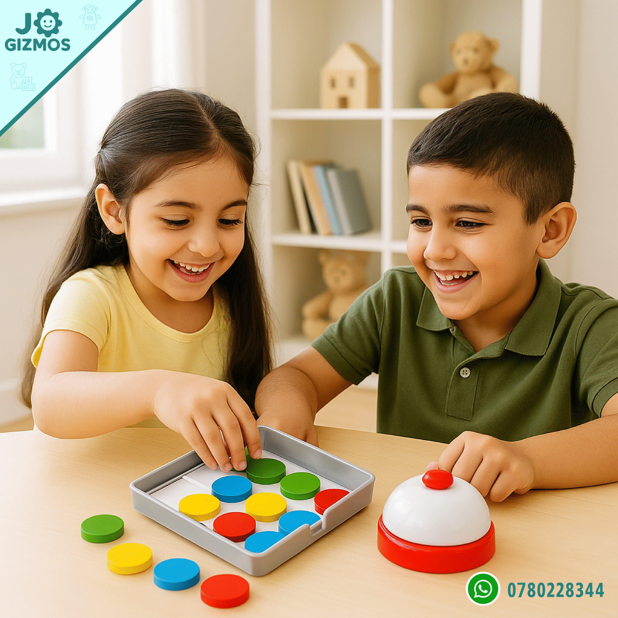 🎲 لعبة تحدي حماسية وسريعة تعتمد على مطابقة الأقراص الملونة حسب بطاقات النماذج. أول من يكمل الترتيب الصحيح يضغط على الجرس ليفوز بالجولة. تساعد في تطوير سرعة البديهة، التناسق بين العين واليد، ومهارات التفكير المنطقي.