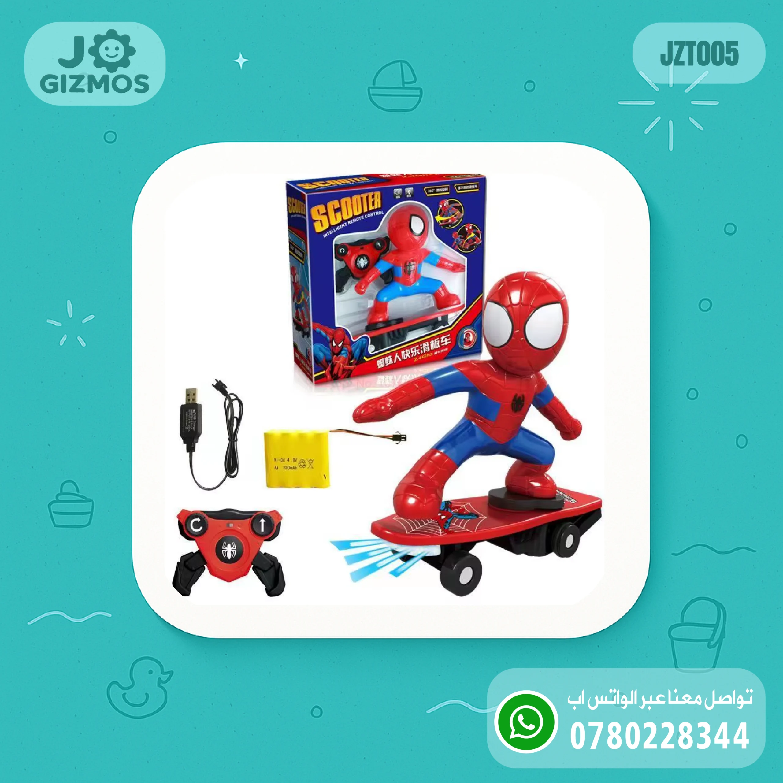 سكوتر كهربائي صغير بتصميم جذاب (لون أحمر)، شخصية بطل خيالي مثبتة فوق السكوتر، جهاز تحكم عن بعد (ريموت)، كابل شحن أو بطاريات، علبة تغليف برسومات واضحة.
